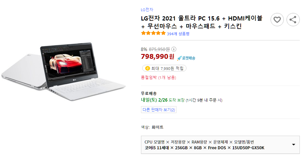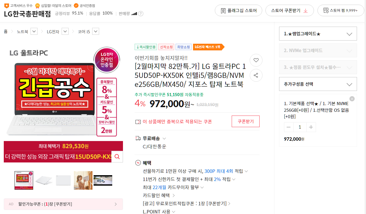 [11번가] [2월마지막 82만특.가] LG 울트라PC 15UD50P-KX50K 인텔i5/램8GB/NVMe256GB/MX450/ 지포스 탑재 노트북