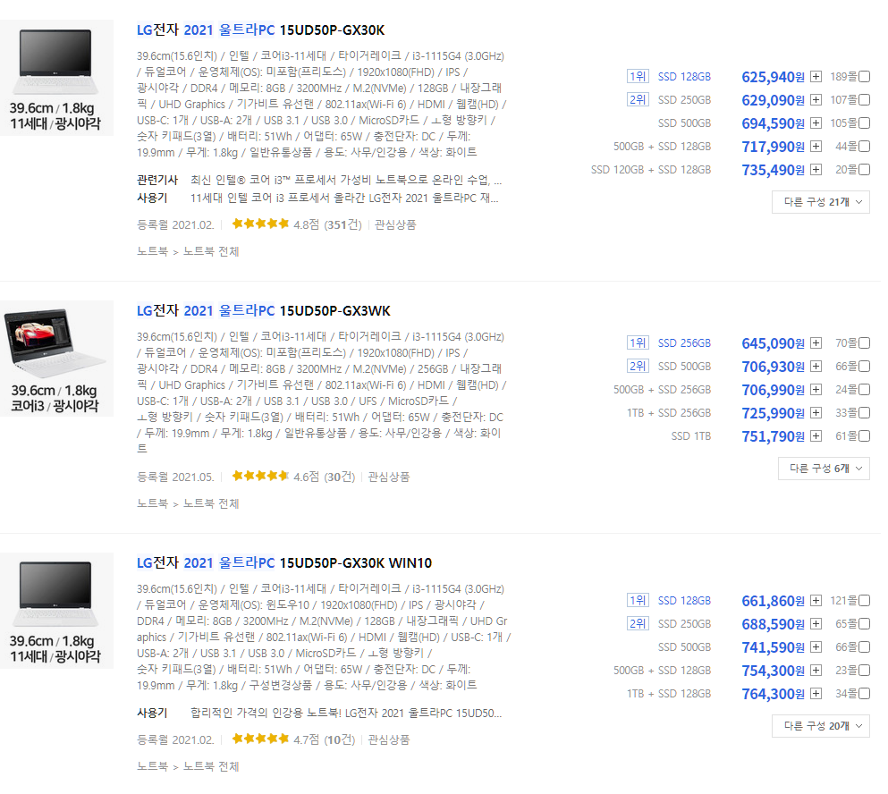 해당 모델이 2021 모델이니 최저가 순으로 다나와 검색을 해보면, 외장 그래픽이 달리지 않아도 무게는 변화가 없는 것 같다. 하긴 외장 그래픽이라 해도 노트북용에다가 MX450이 무게가 얼마나 나가겠냐마는...