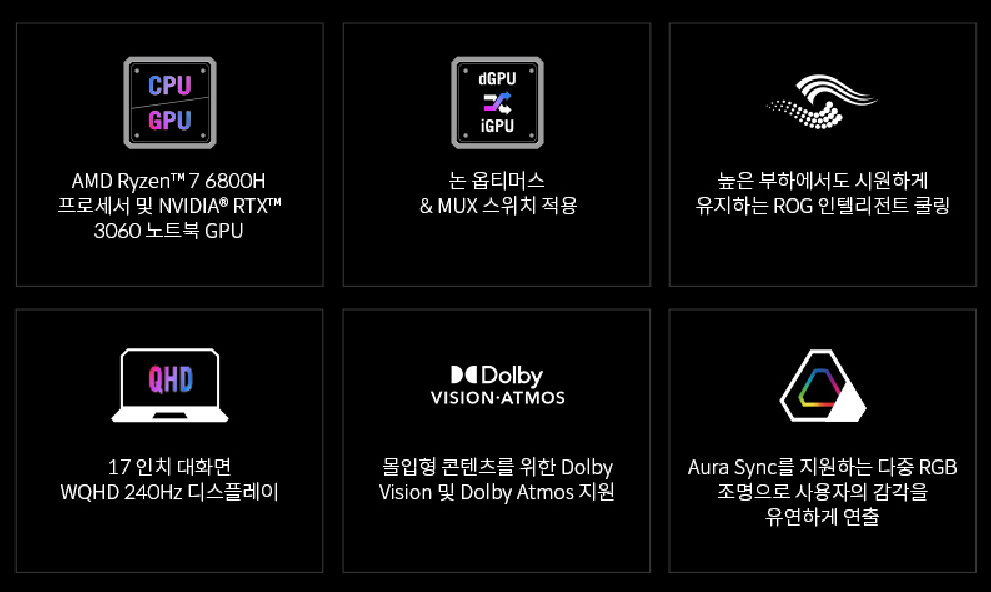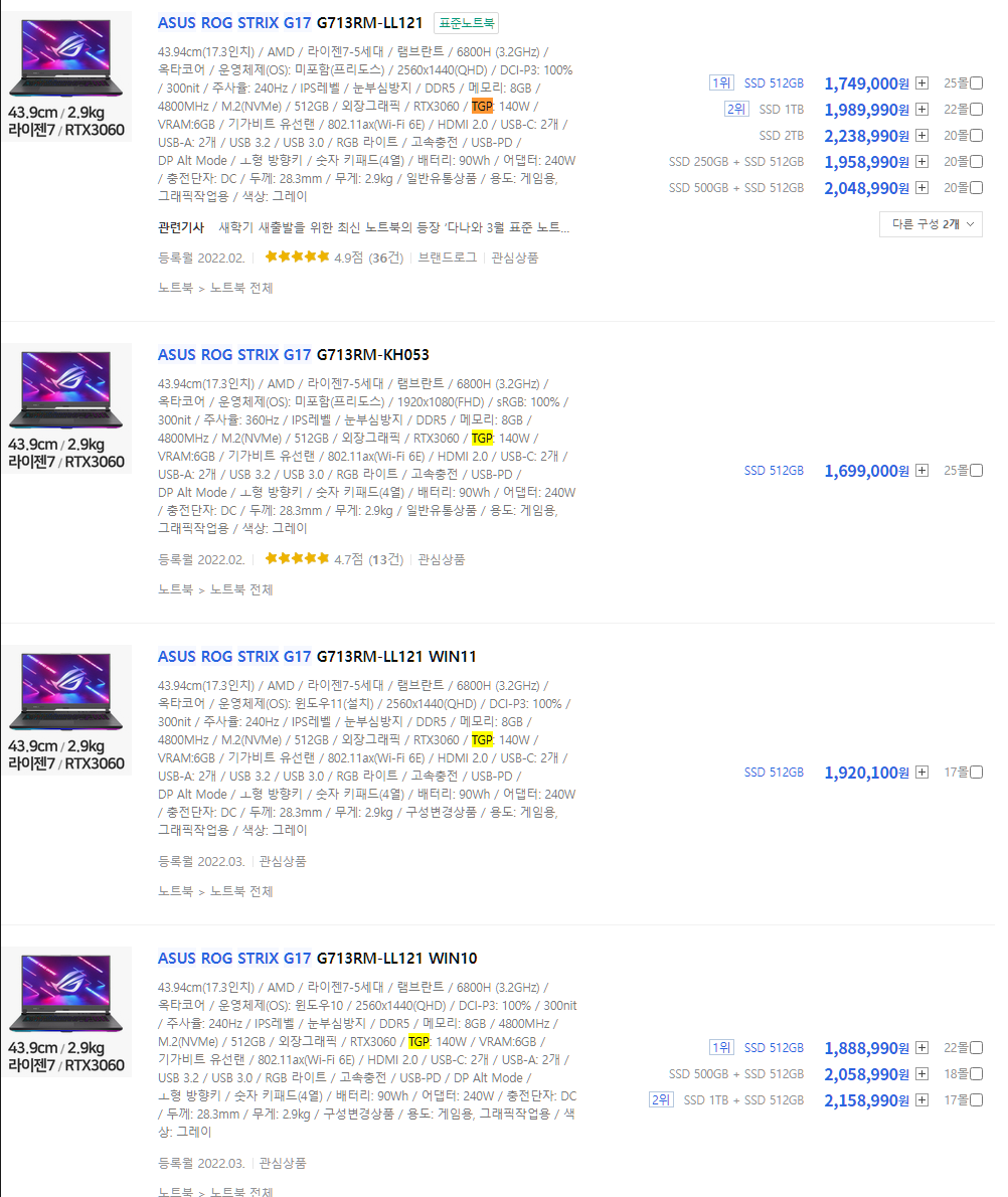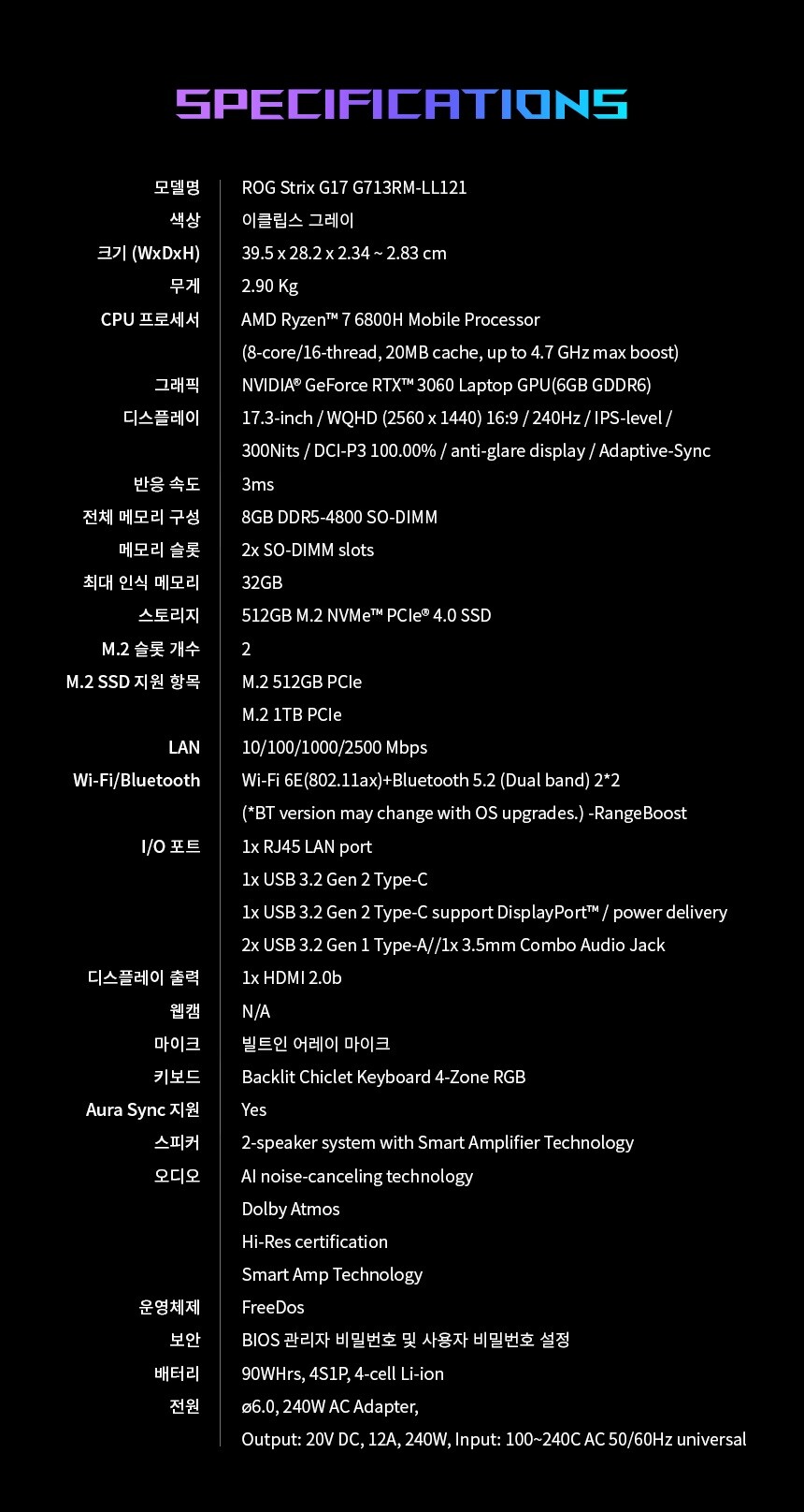 AMD 라이젠7 5세대 6800H를 탑재한 노트북이 나왔습니다. ASUS ROG STRIX G17 모델로, 특징은 17.3인치 43.9cm 모니터에 DCI-P3 100%, 300니트 밝기, RTX 3060탑재에 TGP는 무려 140W네요.